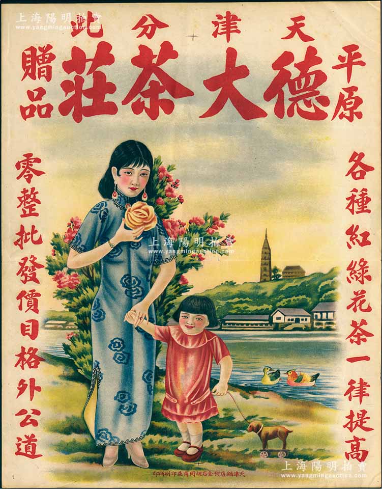 民国时期“天津德大茶庄”大型彩色广告1张,尺寸395×545mm,上印风景、鸳鸯和母女图,形制美观,保存较佳,敬请预览