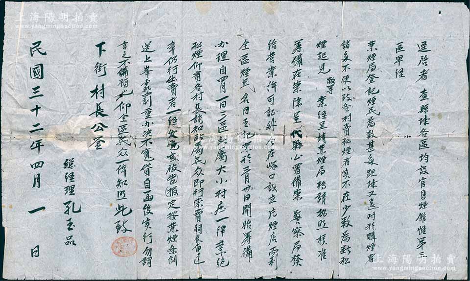 民国三十二年(1943年)“代县第三区(峪口)玉记片烟膏店”总经理孔玉品致“下街村长”公函一则,尺寸颇大625×370mm,事为“县各区均设官售烟馆,惟第三区烟民为数甚多,购烟不便以致各村卖私烟者不在少数,为断私烟,呈请禁烟局核准、代县公署备案、警察局发给营业许可证,在峪口设立“玉记”片烟店,而利全区烟民”等情;此种鸦片文献内容独特,保存尚佳,敬请预览