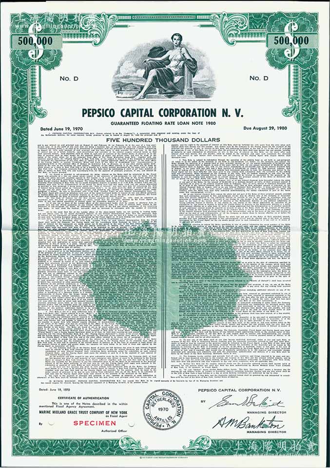 1970年百事公司50万美元债券样本,面额巨大,至1980年到期,雕刻版印制精美;该公司乃全球第四大食品和饮料公司,2018年位居世界500强第144名,其旗下“百事可乐”、“七喜”、“美年达”等系列饮料都已成为世界家喻户晓之品牌;美国藏家出品,罕见,九成新