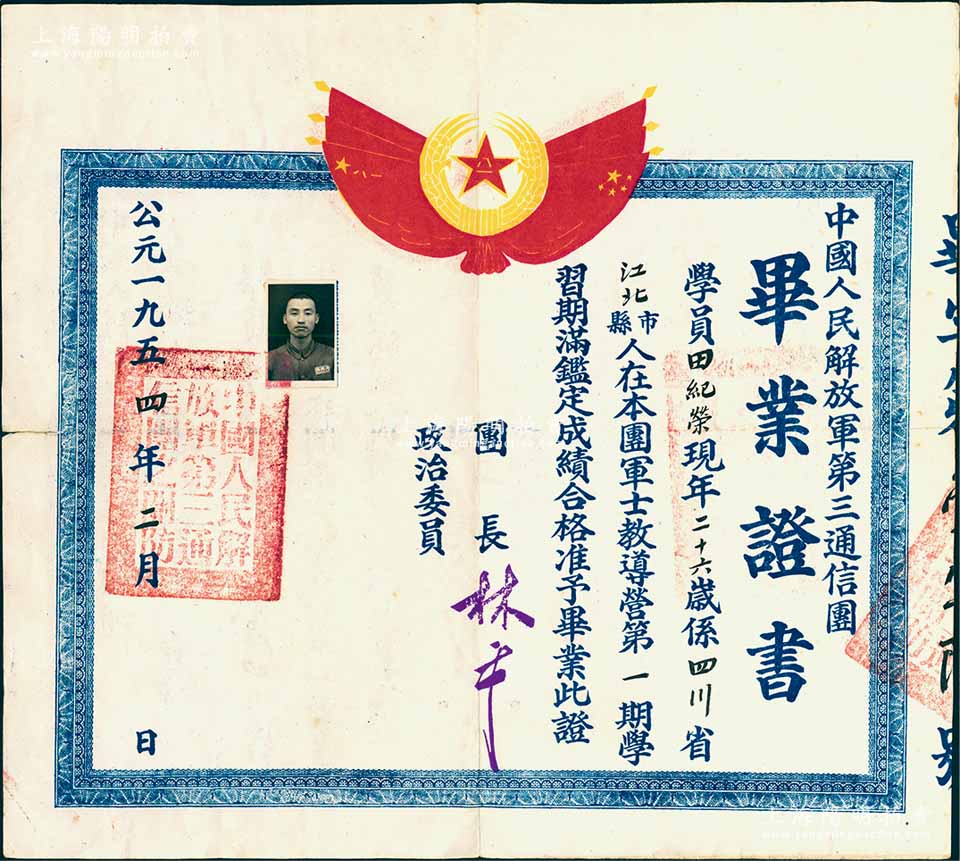 1954年“中国人民解放军第三通信团毕业证书”1张,发给本团军士教导营第一期学员四川江北籍田纪荣氏,上印“八一”军旗等图案,由团长林平签署;少见,近八成新