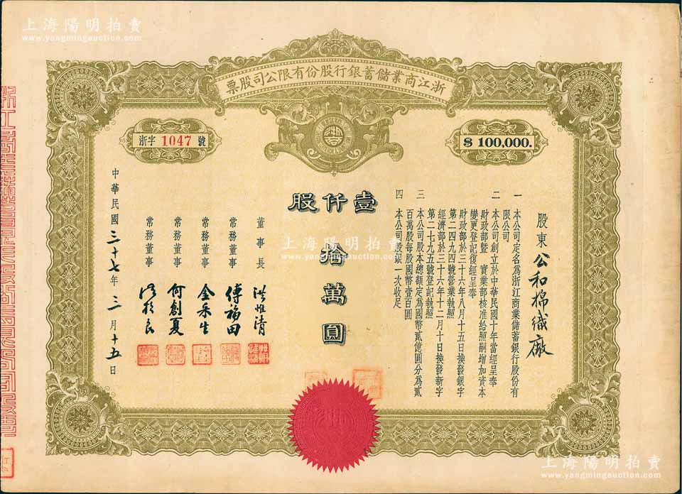 民国三十七年(1948年)浙江商业储蓄银行股份有限公司股票,壹仟股计拾万圆;此为最大面额券,存世极为罕见,八五成新