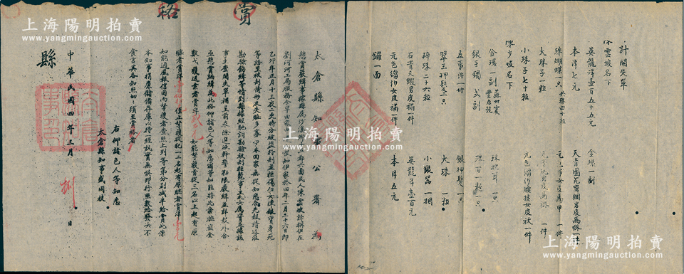民国四年(1915年)太仓县知事公署“赏格”1份,事为沙溪乡民人陈云坡家遭强盗行劫财物,并行凶致其女身死,故悬赏严缉,开列赏格“此案脏盗全获送案者赏洋200元,拏获首从三名以上有原脏者赏洋150元……”,并附“失单”财物明细1张,其上钤有“太仓县知事印”;保存甚佳,敬请预览