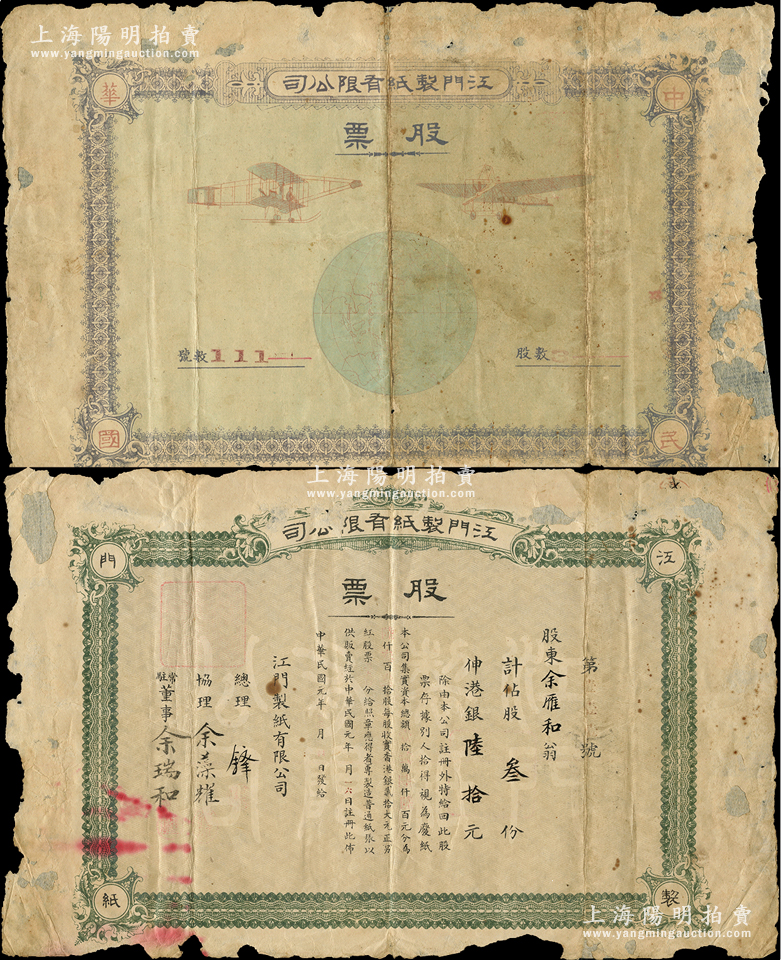民国元年(1912年)江门制纸有限公司股票,股叁份计港银陆拾元,此股票共分正背2张,背印地球和二飞机图;这是中国最早的造纸厂之一,由台山县余觉之创办于1911年,主要由当地华侨和侨属投资,至1913年2月正式投产,其产品“双飞船”牌纸张在两广一带久负盛名,1954年实行公私合营,改称江门造纸厂,至2006年破产;罕见品,亦属首度公诸于阳明,六成新
