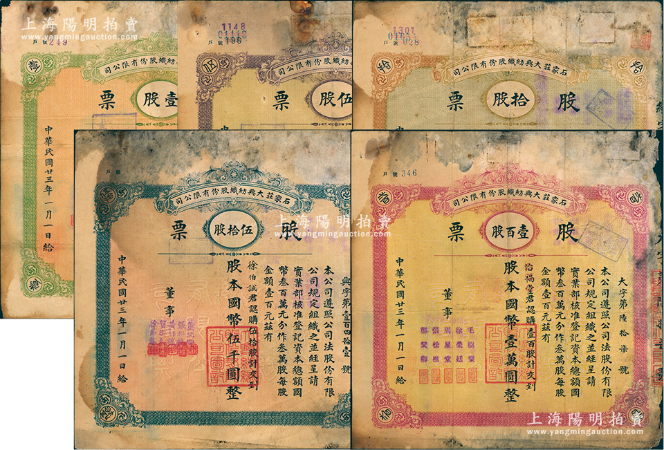 民国廿三年(1934年)石家庄大兴纺织股份有限公司股票共5种大全套,详分:壹股计国币壹百圆、伍股计国币伍百圆、拾股计国币壹千圆、伍拾股计国币伍千圆、壹百股计国币壹万圆;该厂始建于1921年,是石家庄第一家大型纺织工业,历史底蕴厚重;少见品,六至七成新,敬请预览