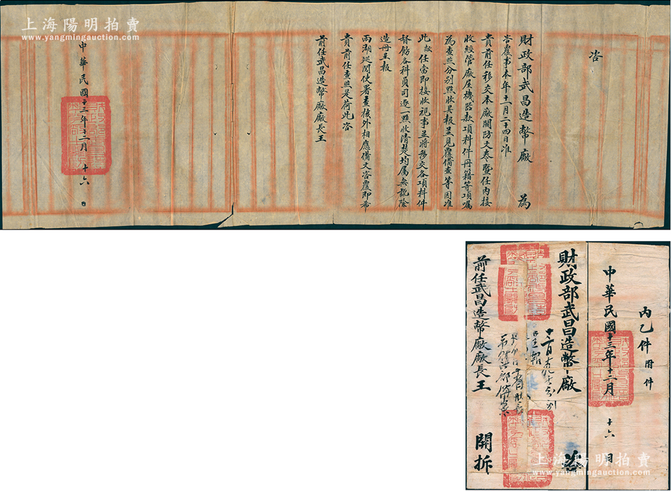 民国十三年(1924年)“财政部武昌造币厂”致“前任武昌造币厂厂长王(连城)”咨文1件,事为“准贵前任移交本厂关防文卷,暨任内接收经管厂屋、机器、款项、料件、册籍等项,嘱为查照,分别点收具报并见覆备查”等情,钤有“财政部武昌造币厂之关防”,且附带原官封;保存较佳,敬请预览