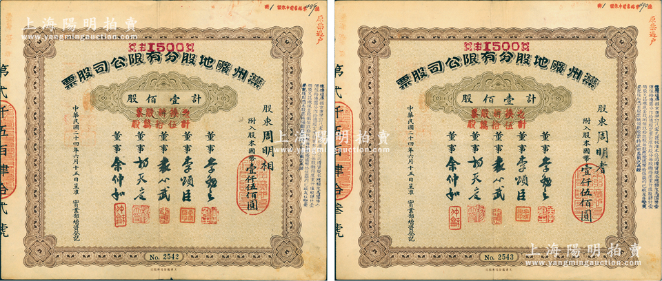 民国二十四年(1935年)滦州矿地股分有限公司股票共2枚连号,均为壹佰股计国币壹仟伍佰圆,又加盖“凭换新股票计伍拾万股”,上有董事袁心武(袁世凯第六子)等签名;中国著名煤矿企业老股票,少见,八成新
