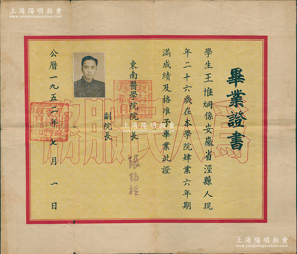 1952年“东南医学院”毕业证书1张,发给安徽泾县籍学生王惟炯氏,由院长张锡祺(眼科专家)签发,背印历年各科成绩表;该校历史可追溯自1926年郭琦元等人在上海创办的东南医科大学,1930年1月更名为东南医学院,1949年底响应中共华东局号召,内迁怀远,成为安徽第一所高等医科院校;1952年改名安徽医学院,1985年更名安徽医科大学;保存尚佳,敬请预览