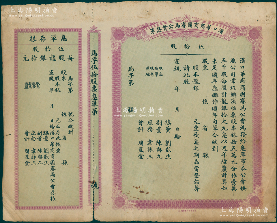 宣统年(1909-11年)汉口华商商团赛马公会息单(即股票),面额伍拾股(每股龙银拾元),未填用带存根,票上所印总董刘歆生为清代三大地产商之一,其组织华商赛马会意在挽回利权、与洋人赛马会以作对抗;苏健先生藏品,罕见,七五成新