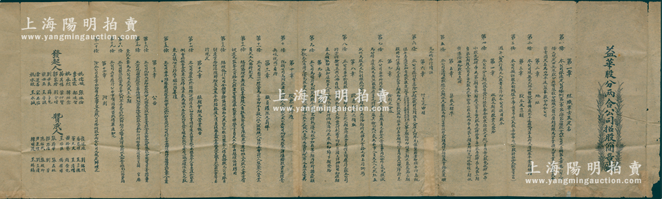 民国早期(山西平遥)“益华股分两合公司招股简章”1份,尺寸颇长,该公司以磨面纺织为营业,拟招资本5000吊,以每百吊作一大股、每拾吊作一小股;内中印明组织宗旨及定名、地址、股本及息额、收股之期间股票之发给、集股之标准、付息之申明、余利之分配、股息红利之领取、特别股分等14章共20条,内容极为丰富,保存尚佳,敬请预览