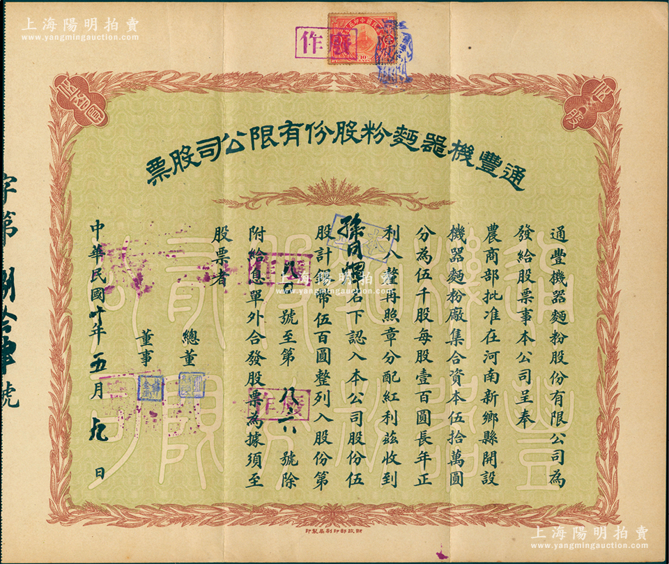 民国十年(1921年)通丰机器面粉股份有限公司股票,伍股计银币伍百圆;该厂开设于河南新乡县,乃北洋政要孙多森(著名实业家,曾任中国银行总裁等职)家族企业;八成新