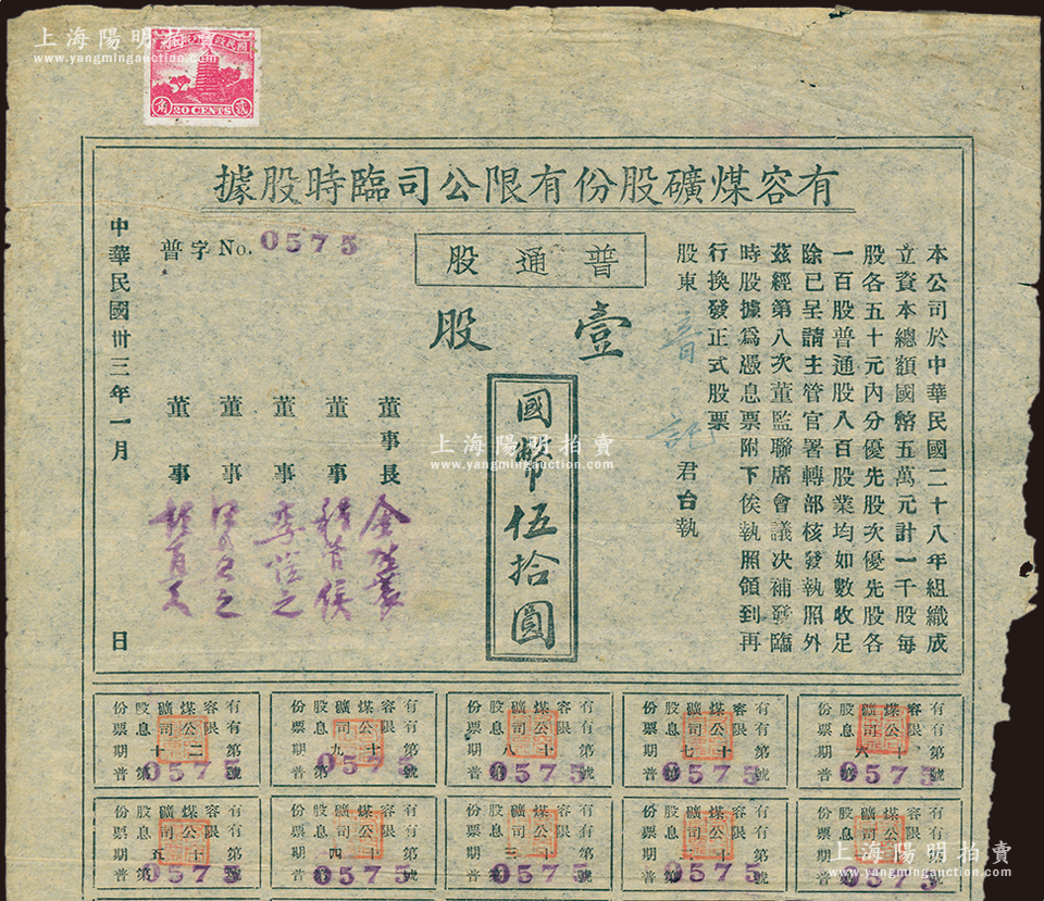民国卅三年(1944年)有容煤矿股份有限公司临时股据,普通股壹股计国币伍拾圆,该煤矿设在安徽省休宁县;七五成新