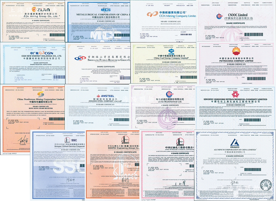 2018至2020年中国著名石油化工、能源冶金企业股票16种,详分:中国石油化工、中石化炼化工程(集团)、中石化石油工程技术服务、中国石化上海石油化工、中国石油天然气、中国海洋石油、中海石油化学、中国有色矿业、中国中煤能源、中国广核新能源控股、中广核矿业、中国冶金科工、中国铝业、鞍钢股份、首钢福山资源集团、紫金矿业集团,面额均为1股,内有水印,属香港上市之H股,九八成新