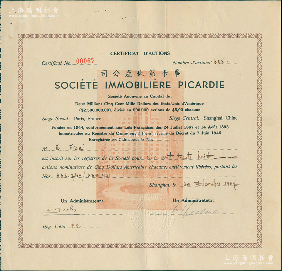 1947年(上海)毕卡第地产公司股票,面额490股(每股美金5元),正中印有上海衡山宾馆老照片(旧称“毕卡第公寓”),乃属老上海外商老股票之大珍品;陈伟国先生藏品,且为其著作《稀珍老上海股票鉴藏录》一书第294页之图片原物,八五成新