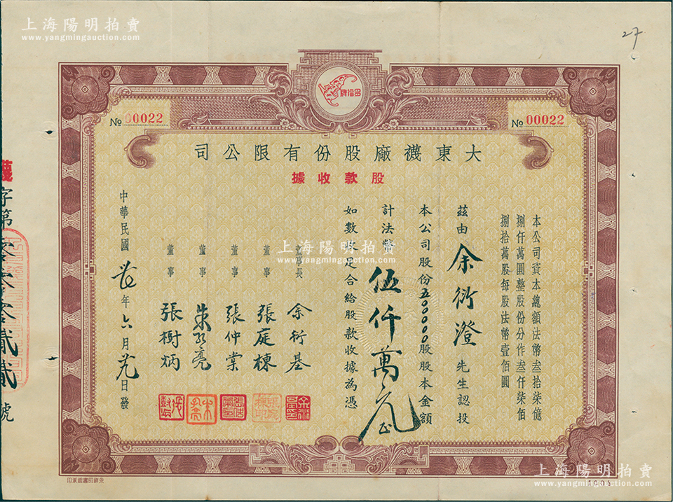 民国卅七年(1948年)大东袜厂股份有限公司股款收据,50万股计法币伍仟万元,少见,八五成新