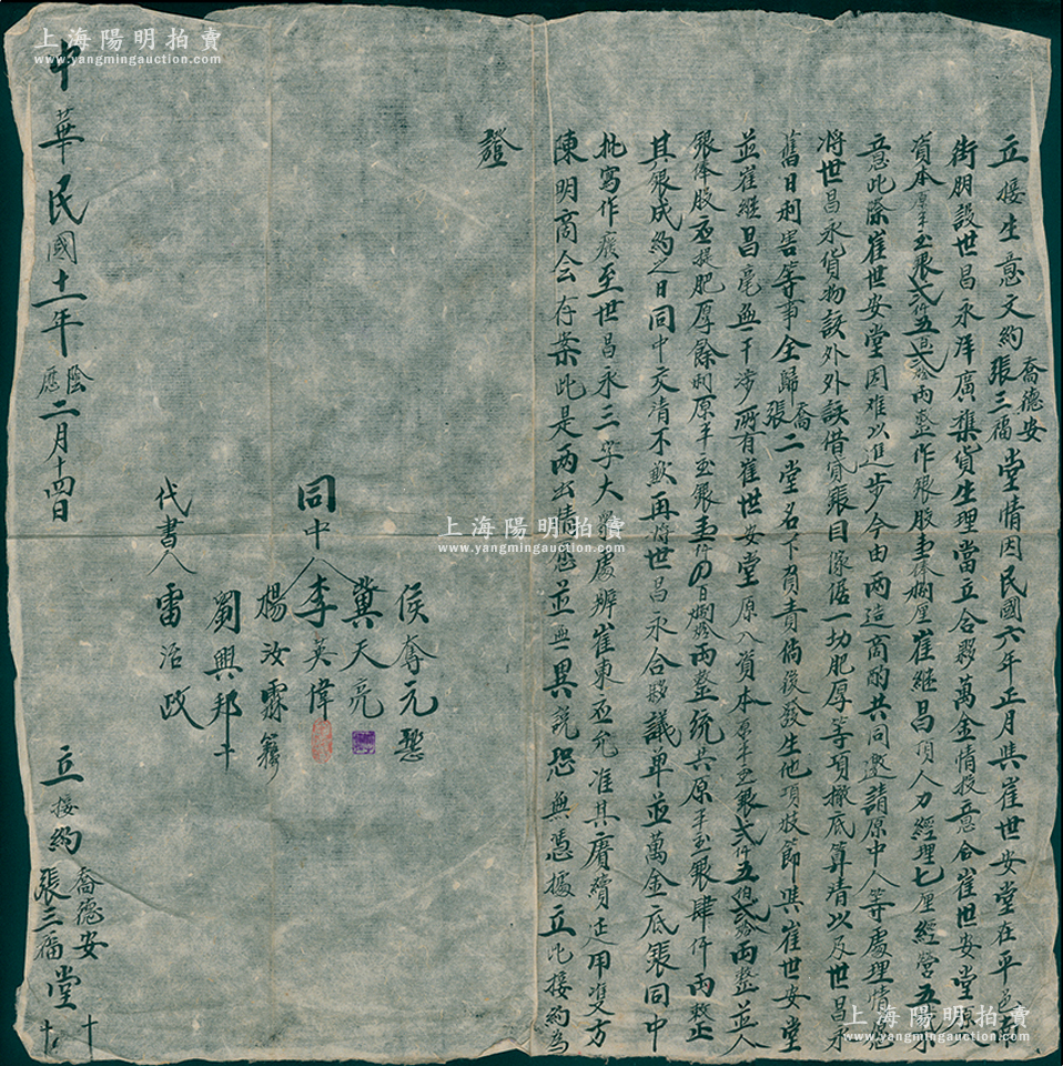民国十一年(1922年)山西平遥“世昌永洋广襍货庄”立接生意文约1份,事为“乔德安、张三福情因民国六年正月与崔世安在平邑南街朋设世昌永广襍货生理,当立合夥万金,情投意合,崔世安原入资本原半主银2520两整作银股壹俸捌厘,崔继昌顶人力经理七厘,经营五载不意,此际崔世安因难以进步,世昌永等事全归张、乔名下负责,倘后发生他项枝节,与崔世安、崔继昌毫无干涉,崔世安应提肥厚余利原半主银1480两,统共原半主银4000两,其银成约之日交清”等情;此种山西晋商退股合同,内容特殊,保存较佳,敬请预览