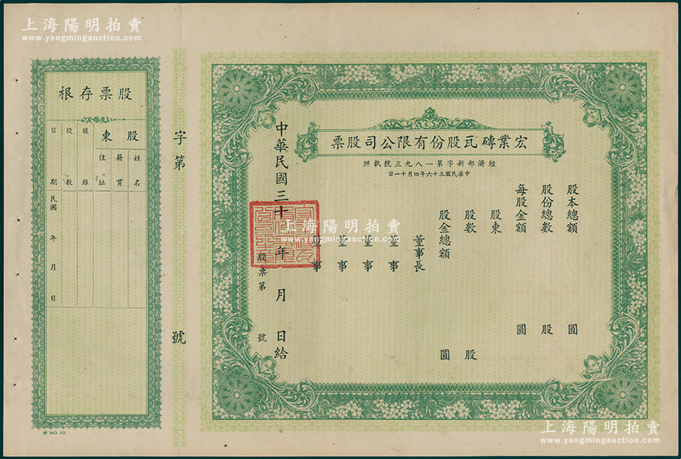 民国三十 年(1947-)宏业砖瓦股份有限公司股票,绿色未填用附存根;该公司位于南京和平门外,由国民党上将蒋鼎文所创办;未折九五成新