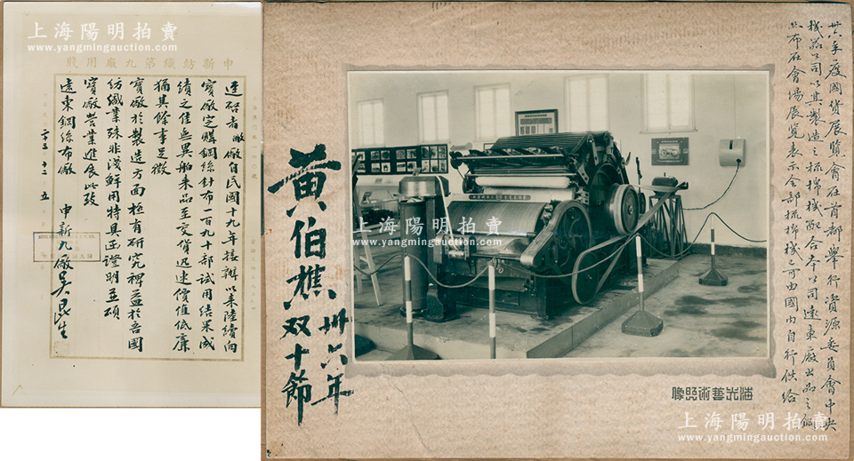 民国卅六年(1947年)上海“远东钢丝布厂”照片集1册,内有各种机器设备、厂房、证书、申新九厂和大成纺织公司证明函照片等,其中1张照片乃属1947年南京国货展览会之际所摄,上有题跋,且有中国工程师学会会长“黄伯樵”墨笔签名;该厂成立于1931年,曾是国内最好的生产纺织梳理器材制造商;保存尚佳,敬请预览