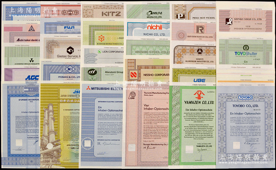 1989至1991年日本各著名企业股权证共60种不同,内含:富士电机、东武百货、爱知电气、旭硝子、狮王、丸富、三菱电机、普利玛火腿、积水建房、日医学馆、日本合成橡胶、多田建設、东洋门锁、东洋纺绩、久保田、伊藤万株式会社等,其中部分属世界500强;这些股权证均为日本经济腾飞时期在欧洲融资发行,雕刻版印制,每张均有满版水印;海外藏家出品,品种丰富,值得重视,九五至全新,敬请预览(注:因品种繁多,故拍品中附有明细清单1份,很方便核对!)