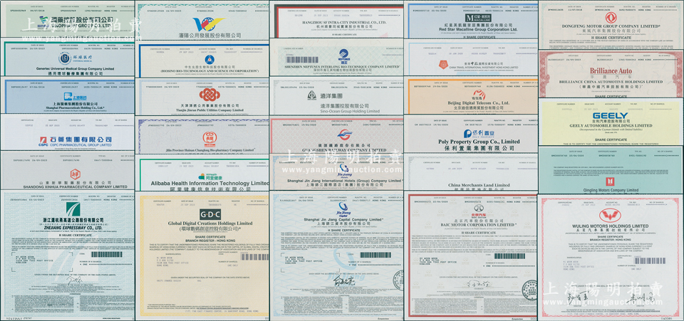 2020至2023年香港上市之中国各大著名企业股票共29种,详分:阿里健康、保利置业集团、招商局置地、北京汽车、东风汽车、华晨汽车、吉利汽车、庆铃汽车、五菱汽车、国药控股、环球医疗、上海医药集团、石药集团、新华制药、沪杭甬高速公路、沈阳公用、中生北控、津燃公用、辉南长龙生化药业、环球数码、顺丰同城、海王英特龙生物技术、远洋集团、广深铁路、上海锦江国际酒店(集团)、上海锦江资本、红星美凯龙家居集团、香港中旅国际投资、北京迪信通商贸公司等,面额均为1股,全部有水印,九八成新
