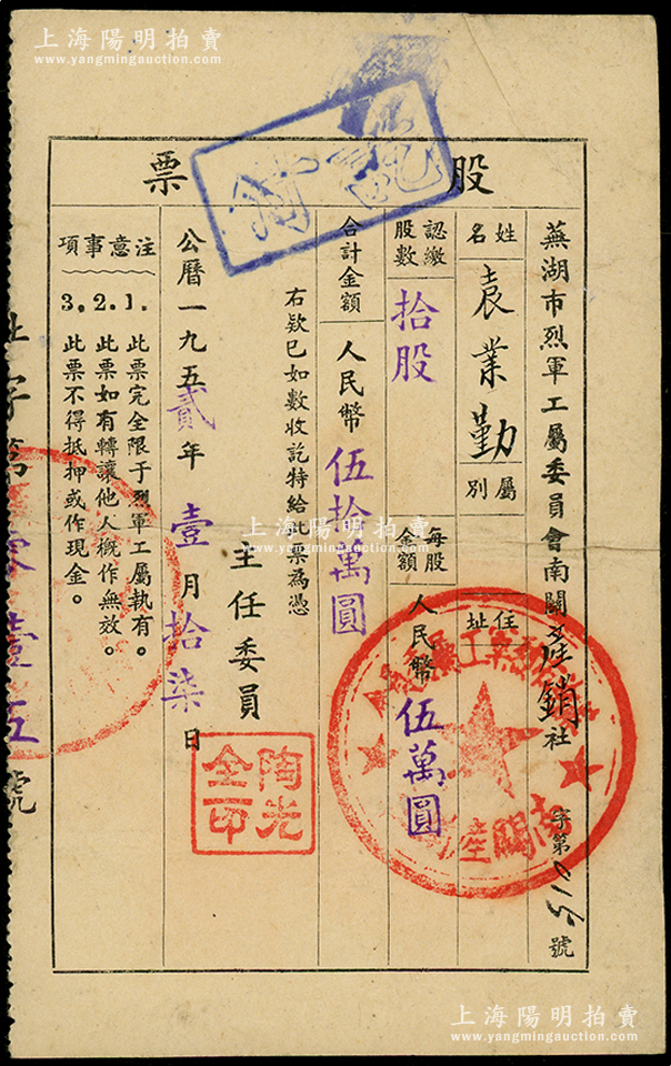 1952年芜湖市烈军工属委员会南关产销合作社股票,拾股计人民币伍拾万元,此种仅限于“烈士军人”家属持有的老股票,颇为特殊,近八成新