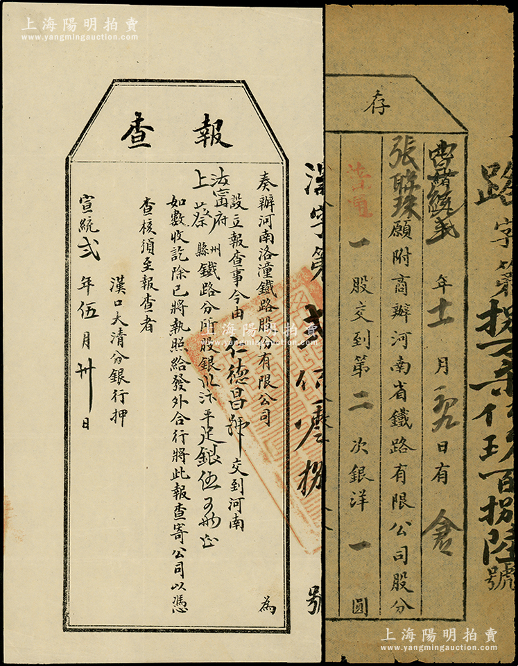 清代河南铁路股票2种,详分:①宣统贰年(1910年)奏办河南洛潼铁路股份有限公司“报查”(即股款收据),由仁德昌号交到汝宁府上蔡县铁路分所股银汴平足银伍百两,汉口大清分银行代收;②光绪改宣统贰年(1910年)商办河南省铁路有限公司股票存根,普通壹股交到第二次银洋壹圆;少见,八成新