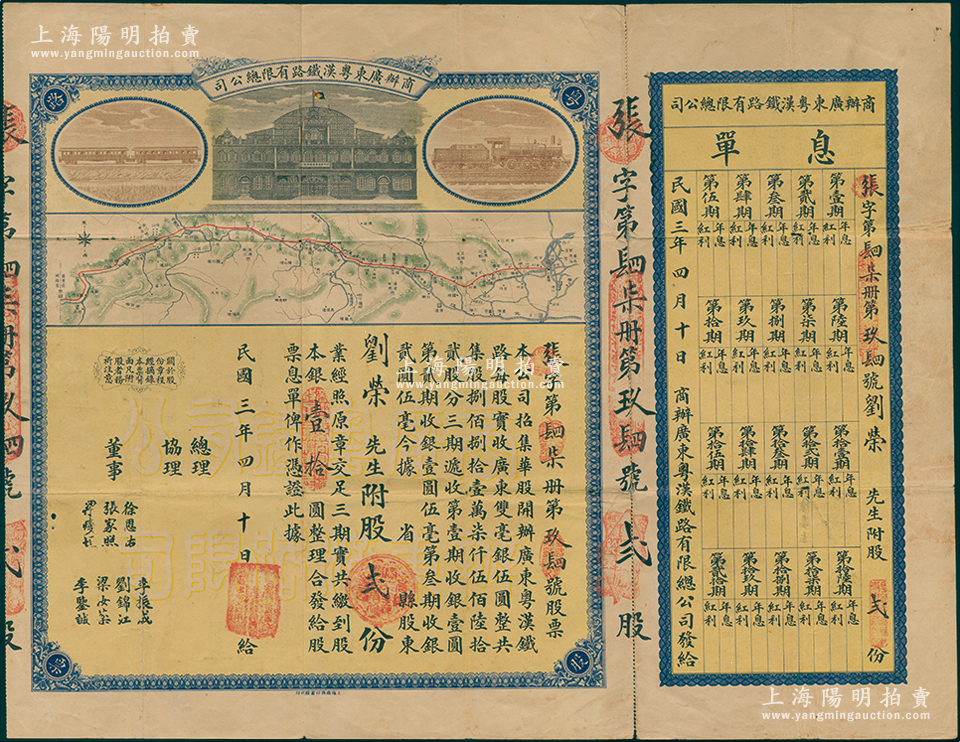 民国三年(1914年)商办广东粤汉铁路有限总公司股票,股贰份银壹拾圆,附带有息单;此股票漏印总理和协理签名,尤为特殊;源于原股东刘荣家族之遗存,香港回流品,七五成新