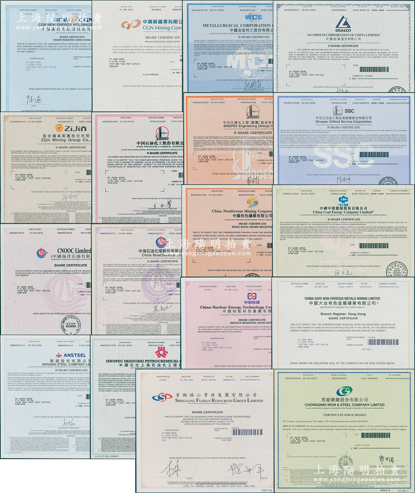 2018至2023年中国著名石油化工、能源冶金企业股票18种,详分:中国石油化工、中石化炼化工程(集团)、中石化石油工程技术服务、中国石化上海石油化工、中国海洋石油、中海石油化学、中国有色矿业、中国中煤能源、中国核建、中国广核新能源控股、中广核矿业、中国冶金科工、中国铝业、鞍钢股份、重庆钢铁、首钢福山资源集团、中国大冶有色金属矿业、紫金矿业集团,面额均为1股,内有水印,属香港上
