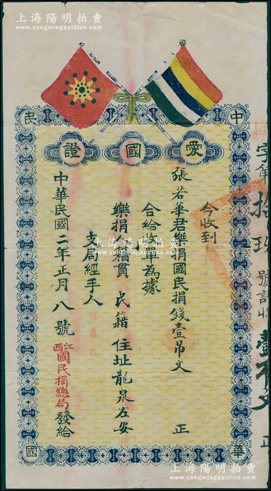 民国二年(1913年)江西国民捐总局“爱国证”,由张若华乐捐国民捐壹吊文,上印铁血十八星旗和五色旗,形制美观,堪称辛亥革命时期票券之精品;国民捐总会是辛亥革命时期以孙中山为总理、黄兴为协理的社会团体,旨在解决国家财政困难,倡导人民爱国精神,及抵制外国银行团的经济侵略野心;罕见且属首度公诸于阳明,近八成新