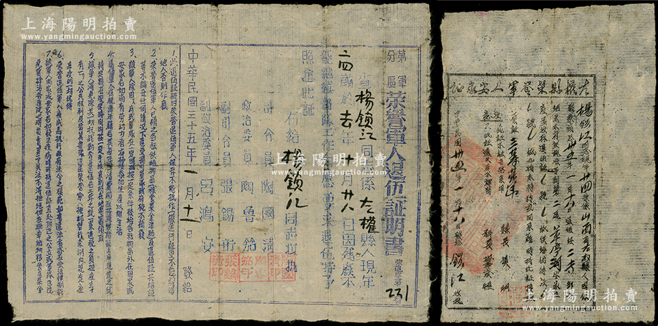 1946年晋冀鲁豫解放区革命证书共2件,均属杨锁江同志所有,详分:①1946年第军分区“荣誉军人退伍证明书”1张,由司令员陶国清等署名;②“左权县荣誉军人安家证”1张,属三等荣军,由县长黄明等署名;保存尚佳,敬请预览