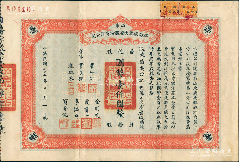 民国二十二年(1933年)山东济南振业火柴股份有限公司股票,普通股拾股计国币壹仟圆,此乃山东最早之民族火柴工业,票上董事丛良弼亦为该公司之创办人;此股票存世罕见,亦堪称中国近代著名民族工业老股票精品;源于著名收藏家陈伟国先生之旧藏,且属其著作《中国近代名人股票鉴藏录》一书第64页之图片原物,八成新