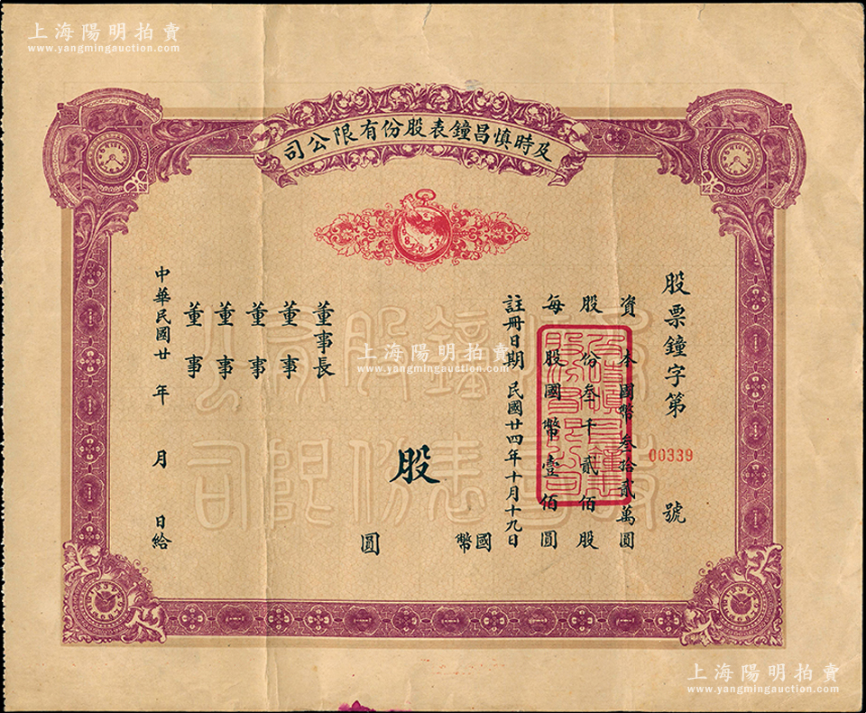民国廿年(1935年-)及时慎昌钟表股份有限公司股票,未填用发行,票上印有公鸡和钟表图,属老上海南京路著名钟表业老字号,八成新