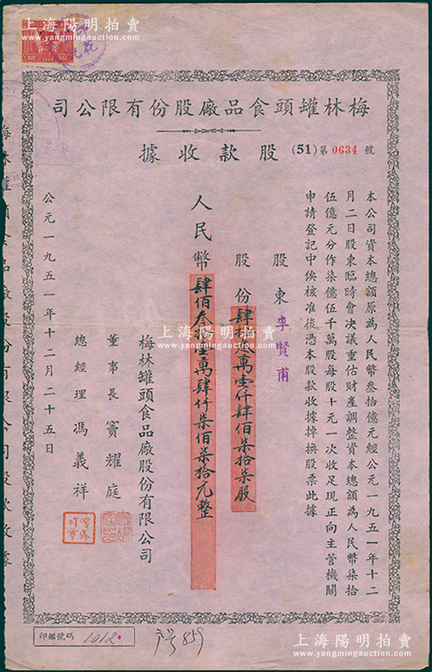 1951年梅林罐头食品厂股份有限公司股款收据,431477股计人民币4314770元,票上董事长窦耀庭乃上海滩著名地产商,投资广泛,曾出资与邵醉翁经营“笑舞台”,并聘请张石川担任顾问,其弟张石川为前台经理,郑正秋为后台经理,促进中国电影业之伊始;该公司迄今仍属上市公司,八成新