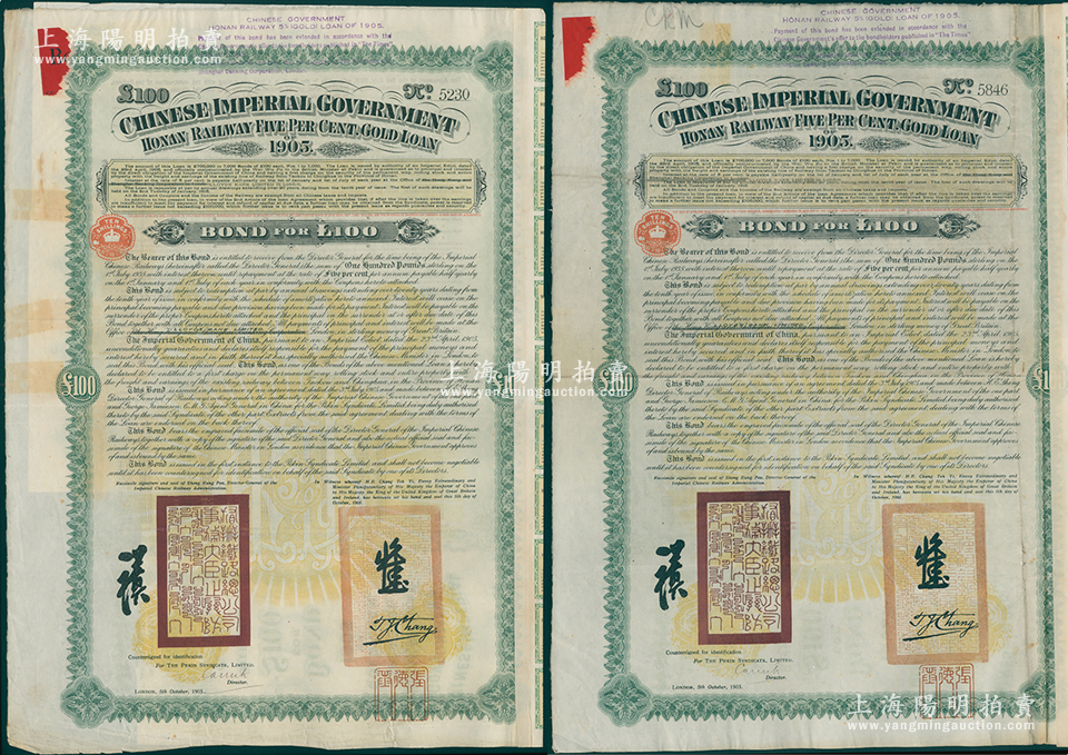 1905年大清帝国政府对外发行河南道清铁路债券100镑共2枚,由英商福公司(Peking Syndicate,Ltd.)代理发行,上有铁路大臣盛宣怀和驻英公使张德彝之关防和签押;此债券共发行7000张,号码从1号至7000号;海外藏家出品,七至八成新