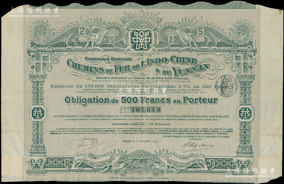 清代1901年滇越铁路股票500法郎,上印双龙图,极富中国传统色彩;滇越铁路是中国西南的第一条铁路,1901年法国开始动工,1903年中法签订《中法会订滇越铁路章程》,随即法国派人踏勘路线,绘制蓝图,并正式成立滇越铁路法国公司;珍罕且属首度公诸于阳明,近八成新