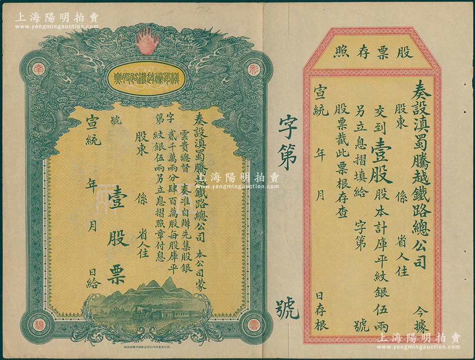 宣统年(1909-11年)滇蜀腾越铁路股票,壹股计库平纹银伍两,双龙图,未填用带存根,日本印制有水印;八五成新