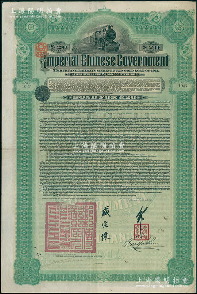 1911年大清帝国政府对外发行湖广铁路债券20英镑,由英商香港上海汇丰银行(Hong Kong & Shanghai Banking Corporation)代理发行(其发行量仅2500张),邮传部尚书盛宣怀、驻英公使刘玉麟签署;海外回流品,八成新