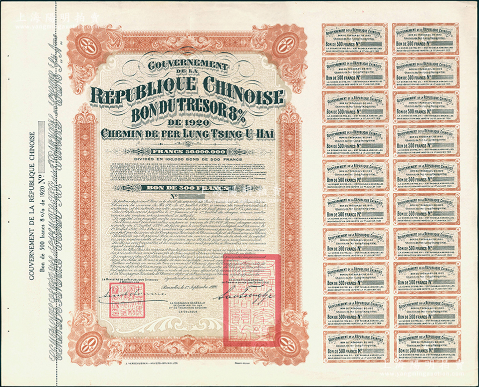 1920年中国政府对外发行督办陇秦豫海铁路公债500法郎库存备份票(无号码),用于债券持有人丢失后补换,在比利时发行,票上印有“中华民国驻比利时特命全权公使印”,附带息票;少见,九成新(据德国高文著《中国对外债券》记载,其发行量仅为300张)