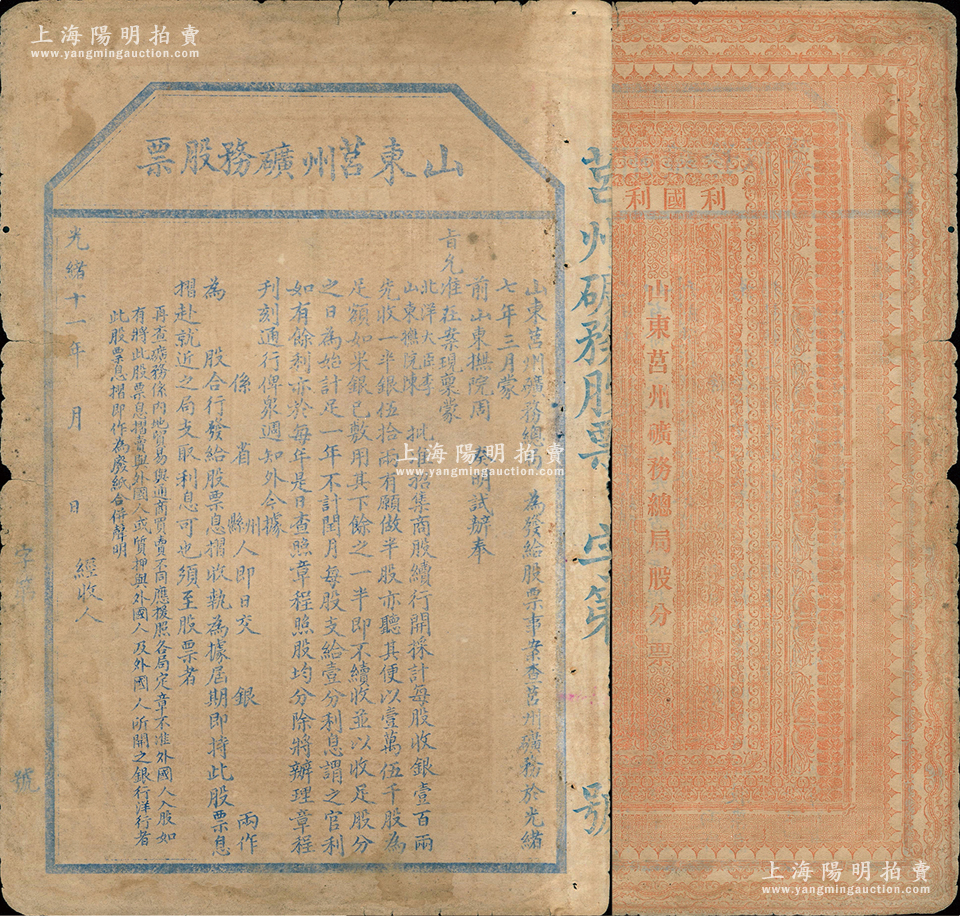 光绪十一年(1885年)山东莒州矿务股票,未正式行用;这可能是中国第一张票面明确印有“奉旨”招股发行,也是第一张明确言明不售予外国人的清代股票;七成新