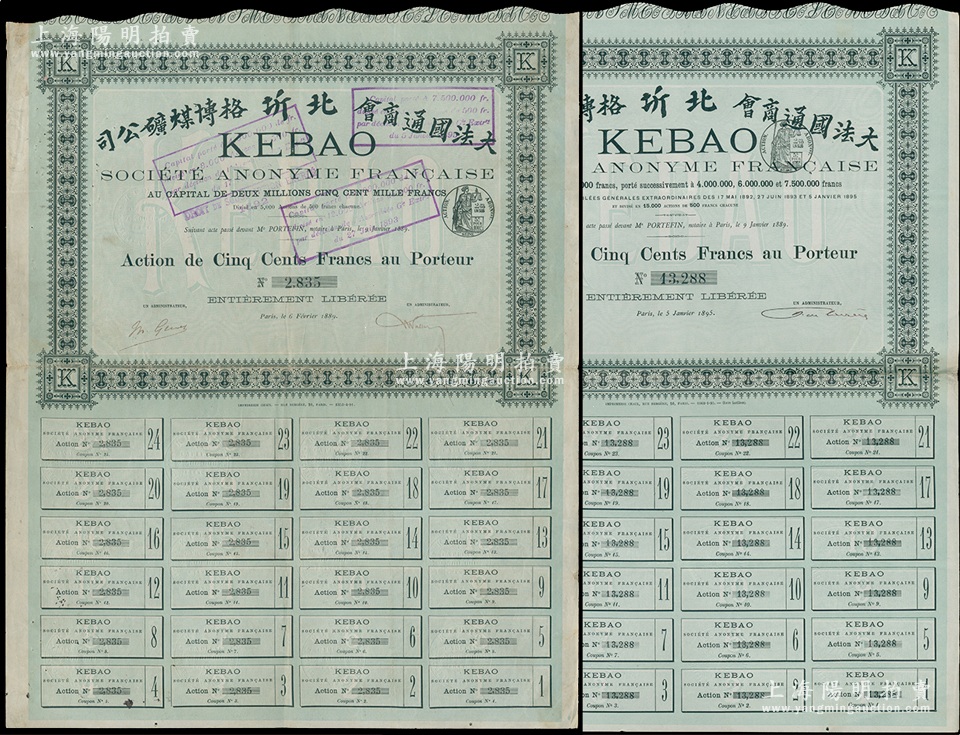 清代(大法国通商会)北圻格博煤矿公司股票共2种不同,均为绿色普通股500法郎,分别发行于1889年和1895年,其上股本总额不同,均附带有完整息票,少见,八至八五成新