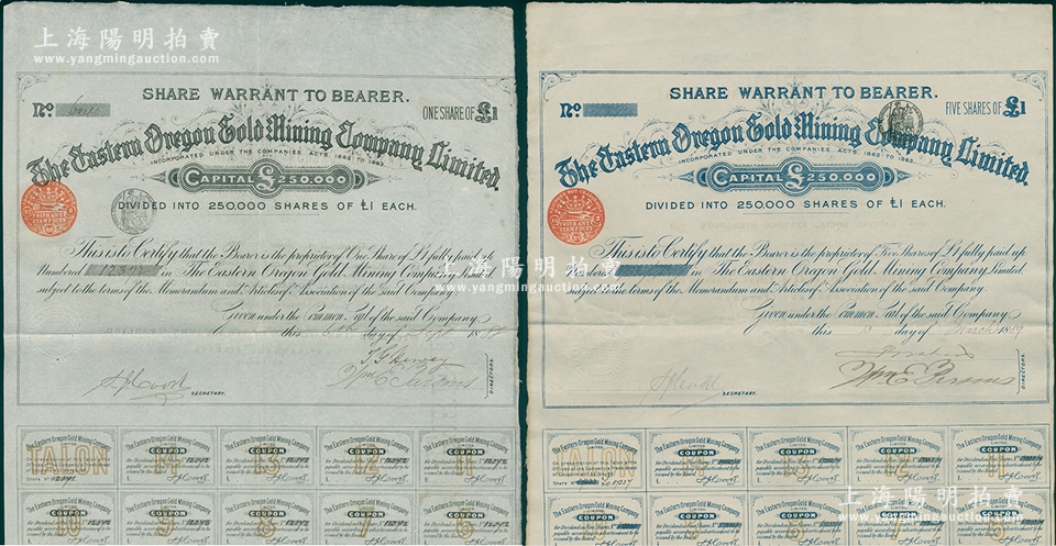 1889年俄勒冈东部金矿有限公司股票共2种,分别为1股和5股(每股1镑),内有水印;自1849年美国加州发现金矿后,迅速掀起淘金热,随后大量广东同胞前往旧金山淘金,到1851年时中国移民已多达2.5万人,并将淘金热一直席卷到旧金山北部的俄勒冈;该公司由英国人所组织,曾雇佣大量广东华侨开採金矿,是清代“淘金热”之历史见证;华侨藏家出品,罕见,八五成新