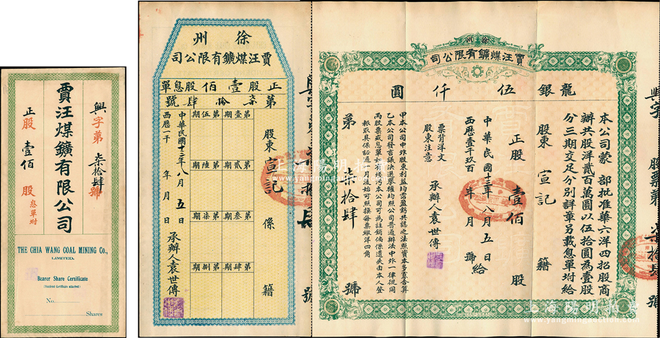 民国十三年(1924年)徐州贾汪煤矿有限公司股票,正股壹佰股计龙银伍仟圆,票上承办人袁世传乃民国大总统袁世凯之堂弟,另附带有封套和股息单;著名民族矿业老股票,少见,八五成新