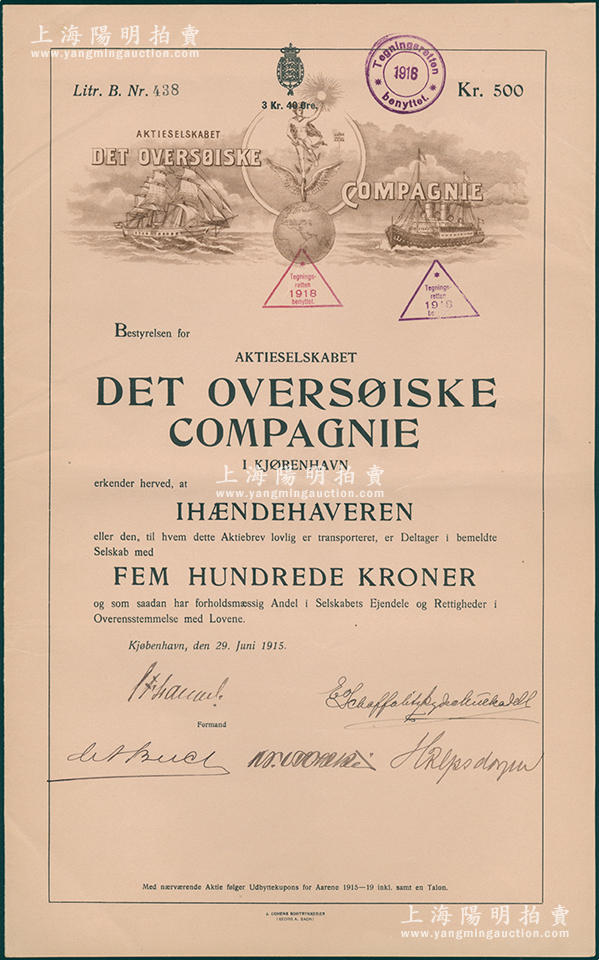 1915年宝隆洋行股票,B股1股计500克朗,附带有息票;该洋行为丹麦对华著名贸易洋行,曾由丹麦国王之叔父艾克赛担任董事长兼总经理,除经营货物进出口外,尚有商运船队30余艘航行在欧亚航线上,另除上海分行外,其汉口、哈尔滨、大连、青岛、天津分行经理均兼任当地丹麦领事之职;罕见品,八成新