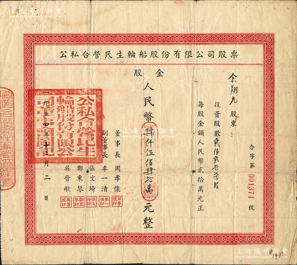 1954年公私合营民生轮船股份有限公司股票,贰佰贰拾柒股计股金人民币肆仟伍佰肆拾万元;该公司为近代中国最大的私营航运企业之一,由著名实业家卢作孚所创办,也是目前股票上市的民生轮船股份有限公司之前身,历史意义厚重;少见,七成新