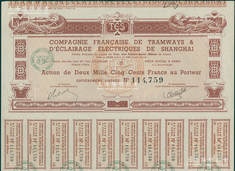 清代末期上海法商电车电灯公司股票,面额2500法郎,上印双龙图,满版水印,附带有息票;海外藏家出品,八五成新