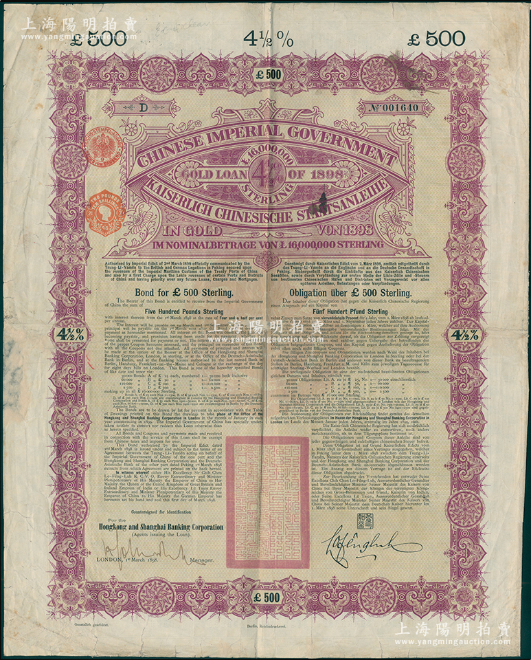 1898年大清中华帝国政府英德续借款金债券500镑(最大面额),由英商香港上海汇丰银行(Hong Kong & Shanghai Banking Corporation)代理发行,且属未打孔注销之流通票;此500镑仅发行2500张,存世极为罕见,海外回流品,七成新