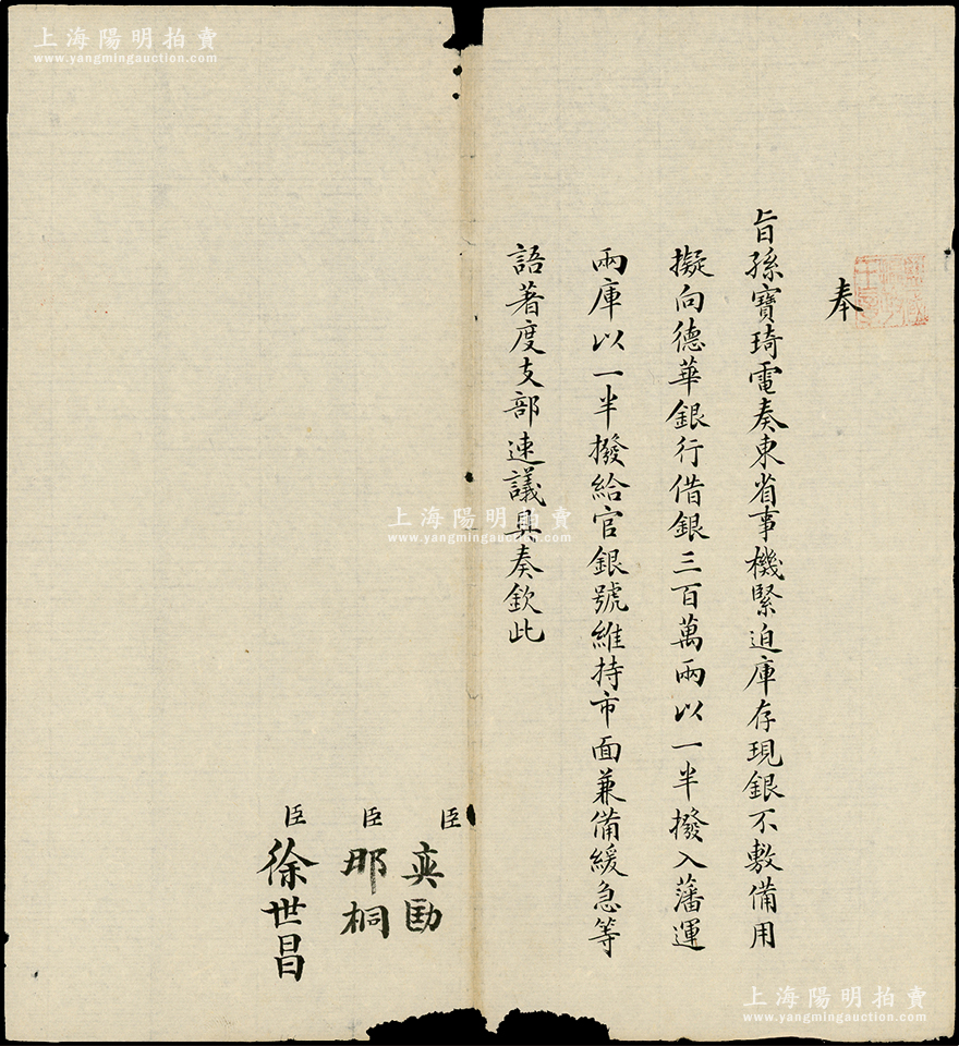 晚清宣统朝“旨意”1件,钤有“监国摄政王章”(宣统之父载沣)玺印,由内阁总理奕劻、内阁协理大臣那桐、徐世昌共同署名,事为“孙宝琦(时任山东巡抚)电奏东省事机紧迫,库存现银不敷备用,拟向德华银行借款300万两,以一半拨入藩、运两库,以一半拨给官银号维持市面兼备缓急”等情,属清代外债之文献;此种摄政王时代之“旨意”存世珍罕,极富史料研究价值,保存尚佳,值得珍视和推重