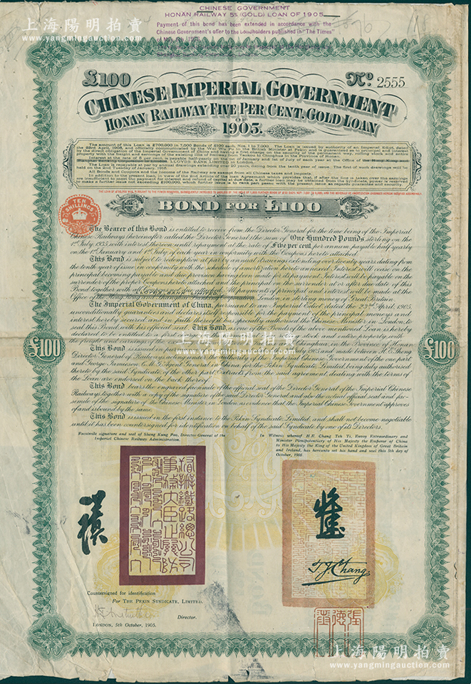 1905年大清帝国政府对外发行河南道清铁路债券100镑,由英商福公司(Peking Syndicate,Ltd.)代理发行,上有铁路大臣盛宣怀和驻英公使张德彝之关防和签押;此债券共发行7000张,号码从1号至7000号;海外藏家出品,七五成新