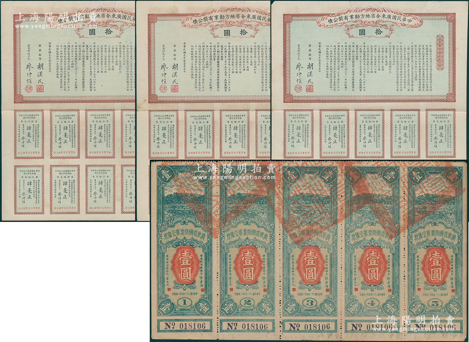 广东债券4枚,详分:1912年中华民国广东全省地方劝业有奖公债拾圆3枚;1932年广东省国防要塞公债票壹圆5张联体;海外藏家出品,八成新