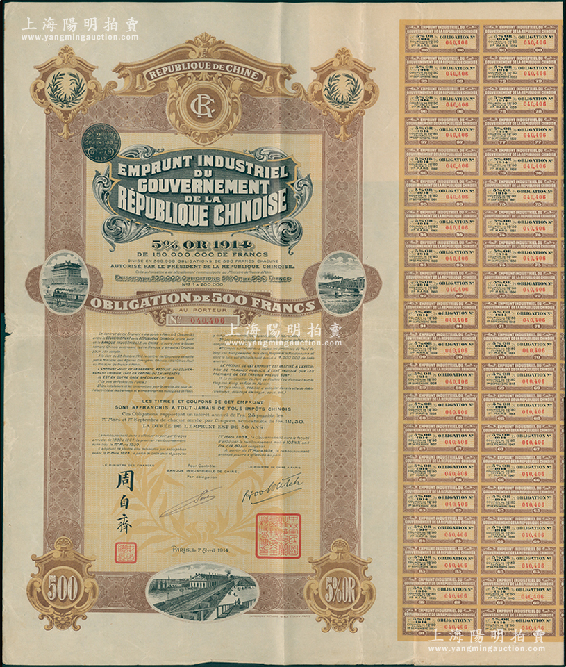 1914年中华民国政府对外发行五厘工业贷款债券500法郎,由中法实业银行(Banque Industrielle de Chine)代理发行,上印有财政总长周自齐签名,附带有息票;海外回流品,八成新