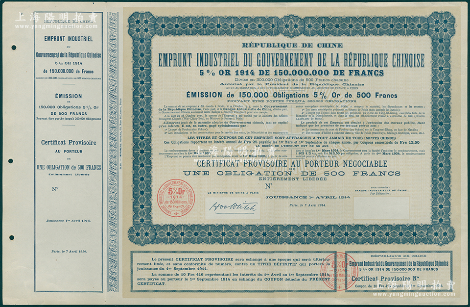 1914年中法实业借款公债临时凭证500法郎,属库存未发行票(无号码),上有驻法公使胡惟德英文签名;海外回流品,少见,八成新
